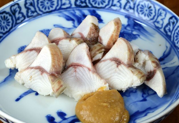 尾を部分をゆでる。表面だけ火が通ったら冷水に落として表面のザラザラした鱗を流す。これを刺身状に切る。この魚、前方はゼラチン質に富み味わい深いが尾に近い部分は非常に淡泊である。酢みそで食べるとやや美味。