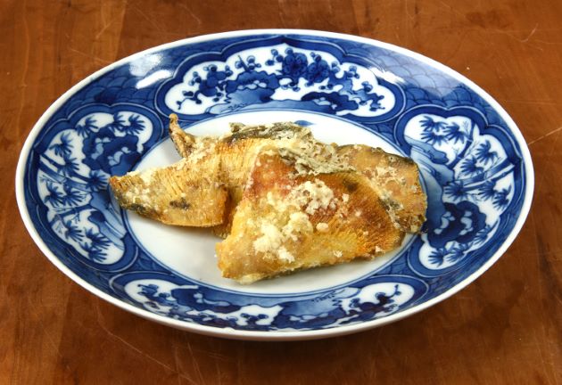 サカタザメの鰭の唐揚げ 胴や尾に近い部分を使ってもいいが、鰭がいちばん香ばしく食べやすい。鰭は一度湯に通して表面のザラザラした鱗を流す。水分をよくきり、片栗粉をまぶしてじっくりと揚げる。サクサクとして中はゼラチン質で甘味が感じられる。