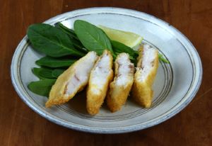 サガミザメのフライ 切り身にして塩コショウする。小麦粉をまぶして、衣(小麦粉・卵・水・少量の油)をまぶしてパン粉をつけて高温で短時間で揚げる。決してまずくはないが、繊維質ではないので全体にしまる。魚らしいうま味にも欠ける。クリックで閉じます![]()