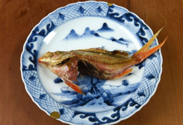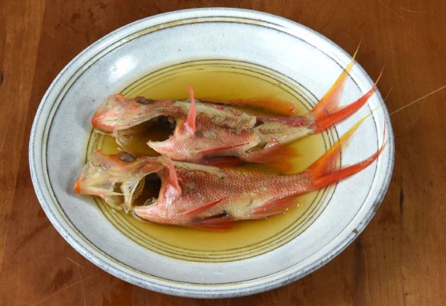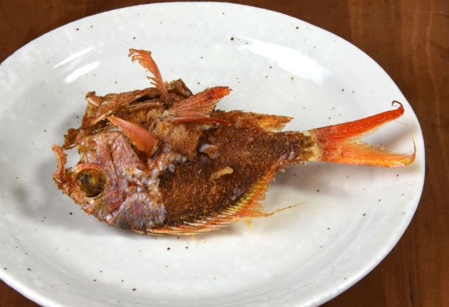 サクラダイの唐揚げ きれいな魚だが、大きくなっても体長15cmどまりの小魚でしかない。水洗いして丸のまま使うのがいちばんいい。しかも頭も骨もあますことなく食べるには唐揚げしか考えようがない。クセのない白身で皮目に甘い風味がある。唐揚げはかなりイケる。