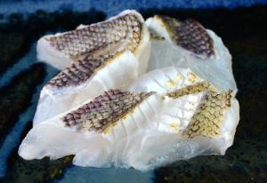 サツマカサゴの焼霜造 水洗いして三枚に下ろす。中骨・腹骨を取り、皮目をあぶって氷水に落とす。水分をよくきり刺身状に切る。1個体でわずかしかとれないが皮のうま味と、身の甘味が感じられ、心地よい食感が楽しめる。あらはみそ汁などにするといい。クリックで閉じます![]()