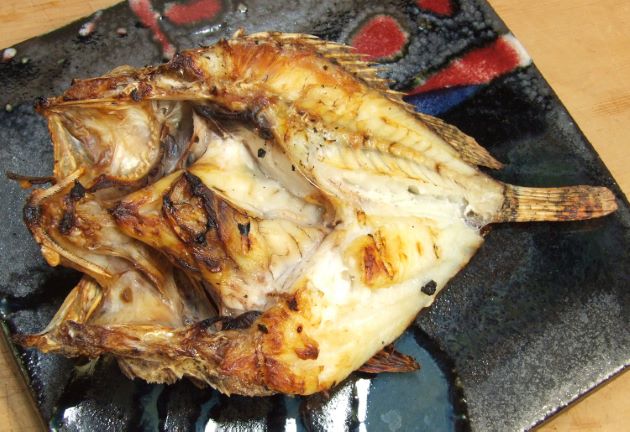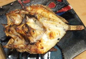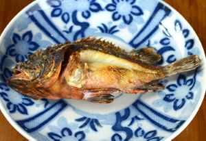 サツマカサゴの干もの 水洗いして開く。振り塩か立て塩にして塩を添加する。水分をよくきり、一夜干しにする。これを焼き上げる。身はふっくらと柔らかく、皮目の風味がいい。食べた後は骨湯にして欲しい。クリックで閉じます![]()