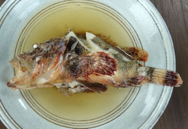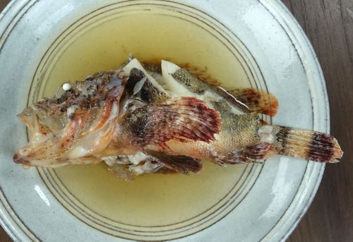サツマカサゴの煮つけ 三枚に下ろすなどして、あれこれ料理を作るにはあまりにも小さすぎる。基本的にはそのままか、適当に切って煮つけるのがいちばん無駄なく食べられる。