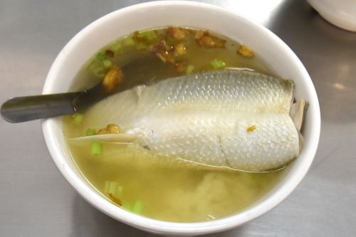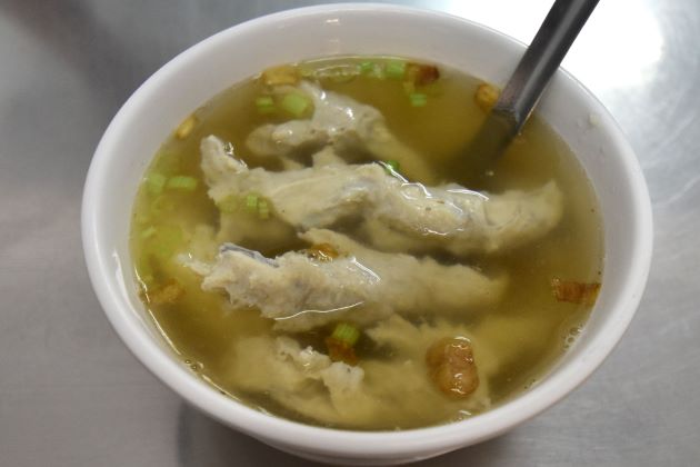 台湾高雄市綜合湯 虱目魚の皮、腹身、など様々な部位の入ったスープ。大100元(日本円で400円)、小80円(日本円で240円)ほど。非常に上品な淡い味わいの湯(スープに)多様な魚の部位の味が相まってとてもうまい。