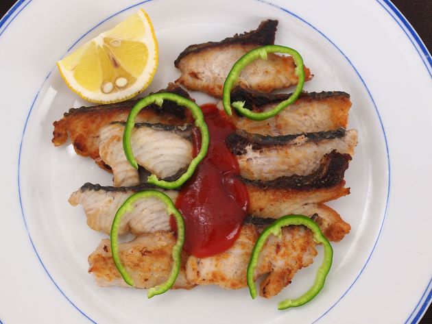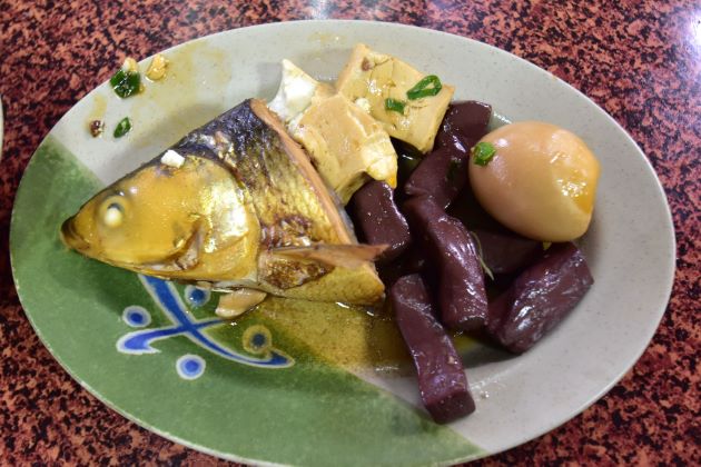 台湾高雄市虱魚目の煮つけ 台湾の煮つけは比較的薄い味つけである。微かに八角の香りがする。頭部は小骨、複雑な骨があって食べにくいものの、非常にうま味が豊か。漁港などでは頭部、腹(肚)、背、中骨の分けられている。また市場でも同様。品書きによって部位を使い分けている。