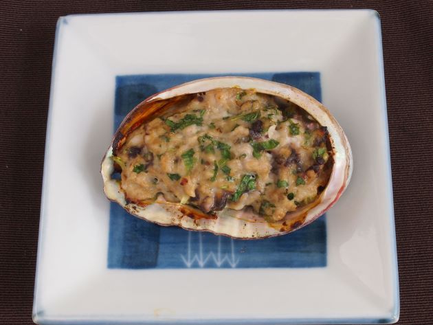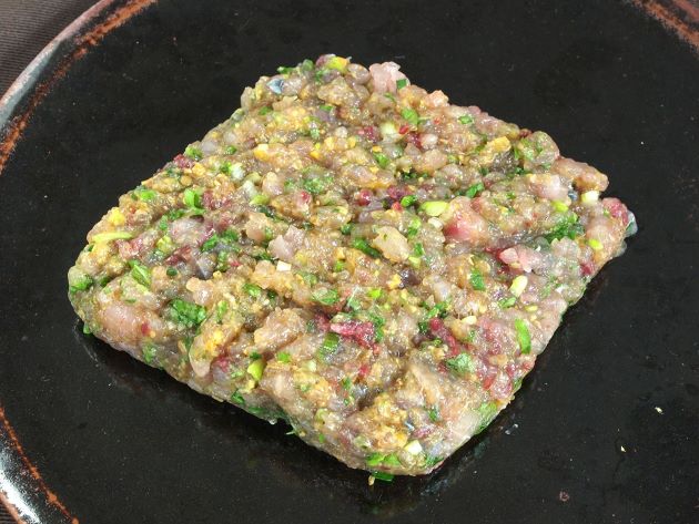 サバヒーのさんが焼き 水洗いして三枚に下ろし皮を引く、みそ、ねぎなどと細かく叩いたものを、アワビの殻などに入れて焼き上げたもの。青魚やニシン目に感じるようなうま味がないものの、あっさりしてこれはこれでおいしい。クリックで閉じます![]()