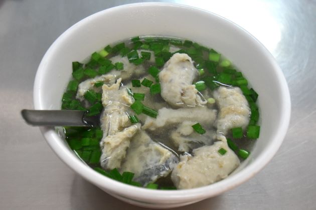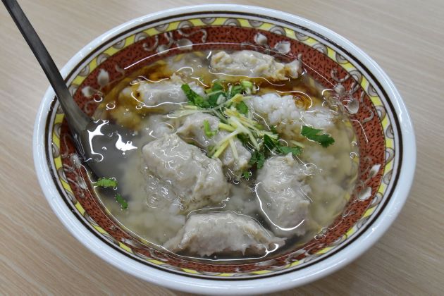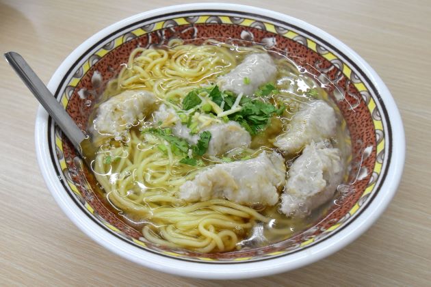 台湾高雄市虱目魚丸子麺 虱目魚(サバヒー)の魚丸子(だんご)を入れたスープに麺。スープの味わいは塩気が少なくとても上品でしかもうま味はしっかりと感じる。魚丸子は浮き蒲鉾のようで口当たりがなめらか。