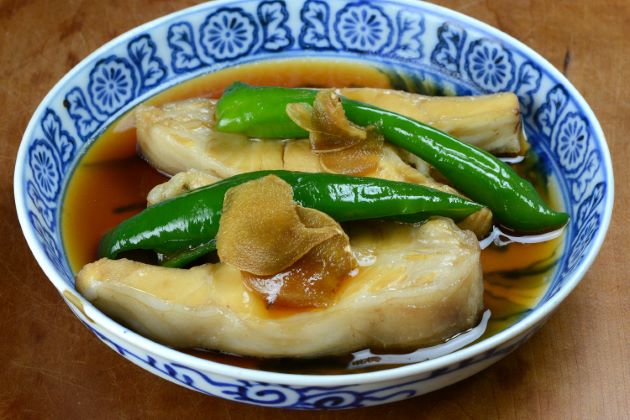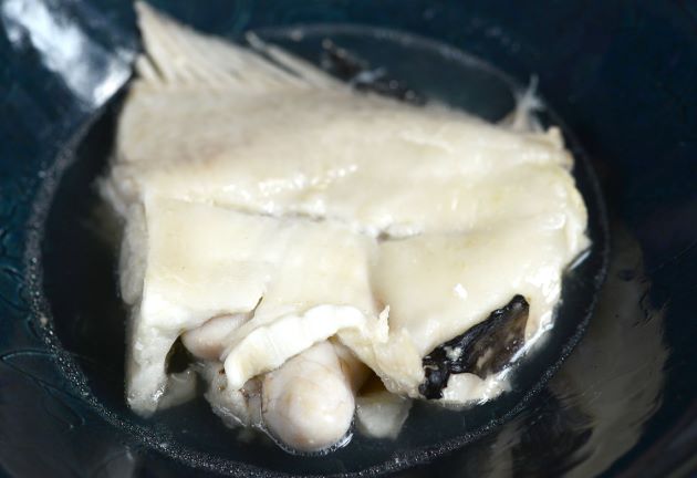 サメガレイの煮つけ ここでは大型なので切り身を使った。小さなものは適当に切る、もしくは丸ごと煮てもいい。皮を剥き湯通しする。冷水に落としてぬめりや血液などを流す。これを酒・しょうゆ・水で煮る。みりん、砂糖で甘みをつけてもいい。煮ると軟らかくふんわりとする。脂があるので口に入れると溶けて消えてしまうよう。非常に美味。食べた後には骨湯にするとうまい。コラムあり。クリックで閉じます![]()