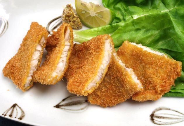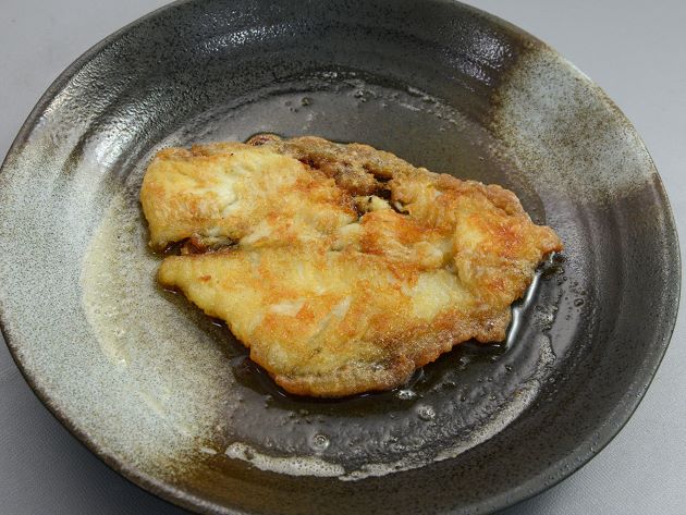 サメガレイのフライ 三陸などからはフィレが入荷してくる。これが実に便利である。適当な大きさに切り、塩コショウして小麦粉をまぶし、衣(卵・水・小麦粉)をからめてパン粉をつけて揚げる。香ばしく中は豊潤、実に味わい深い。クリックで閉じます![]()