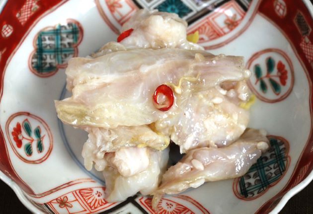 鱗は硬くとりにくい。むしろ鱗はそのままでぬめりを取り、五枚に下ろして料理する方がいい。無眼部分(裏側)の皮は厚みがあってやや強い。骨はあまり硬くない。