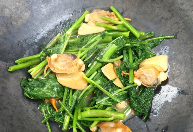 サラガイと空心菜の炒めもの サラガイは剥き身にする。砂などを噛んでいることは少ないが念のために塩水でざっと洗ってもいい。中華鍋などに太白ごま油としょうがとにんにくのみじん切りを入れて熱し、空心菜とサラガイの剥き身を一緒に入れて一気に炒める。味つけは塩コショウのみ。香酢(黒酢)、しょうゆ、中華スープなどを使ってもいいし、八角などの香りづけをしてもいい。クリックで閉じます![]()