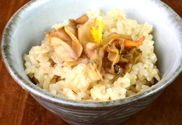 サラガイの炊き込みご飯 二枚貝の中でも上品で草がない。熱を通しても硬くならないのも魅力的である。刺身に開いたときのひもや貝柱などを集めて置く。まるまる軟体を使ってもいい。砂などを噛んでいるのでていねいに塩水で洗い。酒と薄口醤油で味つけをして、生姜のせん切りと一緒に水飯の用意をした釜に入れて炊き上げる。クリックで閉じます![]()
