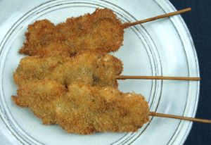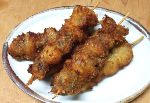 サルボウの串カツ 二枚貝のフライというとマガキだけれど、実は軟体の大きいハマグリ、アカガイ、ホンビノスでも作れる。問題は値段である。サルボウは安いので、気安く作れるのがいい。剥き身にする。泥などを嚙んでいたらていねいに洗い、水分をきる。串に刺し、塩コショウして小麦粉をまぶし、溶き卵にくぐらせてパン粉をつけて揚げる。カキフライと同等に魅力的。とてもおいしい。クリックで閉じます![]()