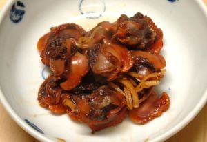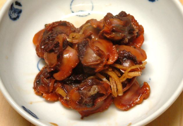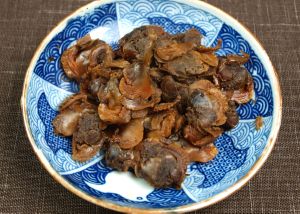 サルボウガイの煮つけ 剥き身を買うか、自分で剥き身にする。これを塩水などで洗い、酒・みりん・しょうゆであっさりと煮て、漬け込んだもの。あまり煮すぎると佃煮になってしまう。味つけが薄めなのでご飯のおかずというよりも酒の肴かも。クリックで閉じます![]()