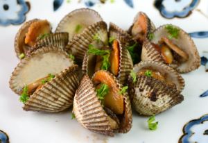 サルボウのワイン蒸し 泥を嚙んでいないものが出に入ったら、そのまま酒蒸しやワイン蒸しになる。笊などにいれてザクザクとていねいに洗う。水分をきっておく。フライパンに多めのオリーブオイル・にんにく・鷹の爪を入れて火をつける。香りがてってきたらサルボウを入れ、白ワインを加えて蒸し煮にする。クリックで閉じます![]()