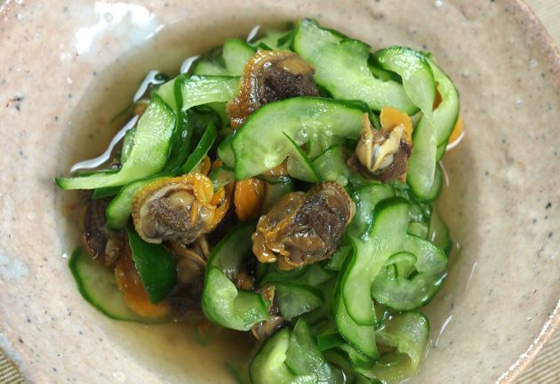サルボウガイの酢の物 塩ゆでしたものをきゅうりもみと合わせて二杯酢、もしくは三杯酢に漬け込む。ゆでたものが手に入れば、それを使う。活けなら貝殻のまま塩ゆでし、貝殻が開いたら殻から外し、泥を噛んでいたら冷ましたゆで汁でよく洗い、水分をよくきり使う。クリックで閉じます![]()