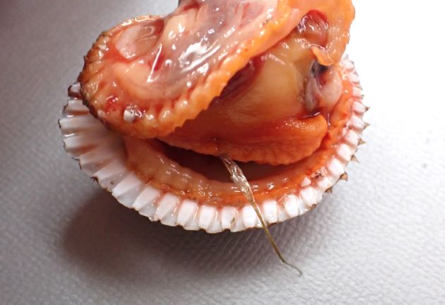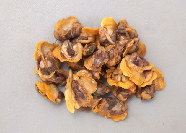 できるだけ大きなものを選ぶ。よくざくざくと洗い、剥き身にする。貝柱とヒモを切り取り、分けておく。皮膜や汚れを落とし、足の部分を半割にして内臓を切り取る。これを塩水でさっさっと洗う。ヒモと貝柱はていねいに皮膜を取り、足と同じように塩水で洗って水分を切る。塩水で洗うのではなく塩をまぶして少しかき回して洗ってもいい。