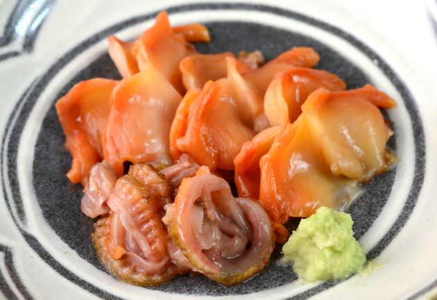 サルボウガイの刺身 本種が刺身になること自体しらない人が多いが、東京湾周辺でも山梨県などでも刺身にして食べている。