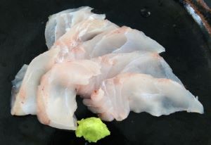 シマハタの刺身 鱗をすき引きして水洗い。三枚に下ろして血合い骨・腹骨を取り皮を引き刺身に。血合いがよわく、微かに赤みがかった白身だ。身に甘みがあるものの、取り立てて特色のある味ではない。クリックで閉じます![]()