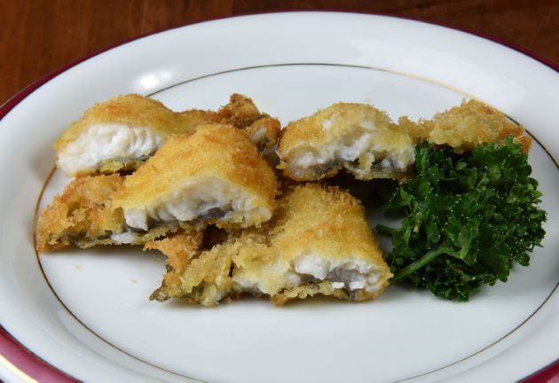 シモフリガレイのフライ あえて言うと身は、スケソウダラに似ている。水分が多く嫌みがない。ほどよく繊維質なのだけど、この繊維は弱く熱にとけてエキスになる。五枚に下ろして皮付きのまま水分をよくきる。塩コショウして小麦粉をまぶして衣(卵・小麦粉・水)をからめてパン粉をつけて高温で短時間揚げる。パン粉の香ばしさの中はふんわりと柔らかく、ジューシーである。フライ材料として非常に優れている。クリックで閉じます![]()