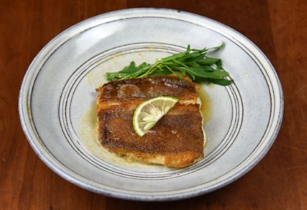 シモフリガレイのムニエル 水洗いして切り身の水分をペーパータオルなどにくるみよくとる。塩コショウして小麦粉をまぶしてこんがり香ばしくソテー、仕上げにバターで風味づけする。表面はかりっとし、ナイフを入れると味わい深いエキスが流れ出してくる。このエキスとバターの相性が極めていい。ビールにも合うがご飯がすすむ。