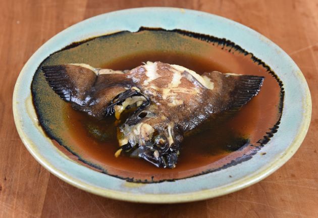 シモフリガレイの煮つけ 頭部を煮つけ。今回の固体の肝は小さく水っぽかったので使わなかった。湯通しし残った鱗とぬめりを流す。水分をよくきり、酒・醤油・水であっさり煮た。砂糖やみりんで甘味をつけてもいい。身が硬く締まらず、嫌みのない味わいだが、本種の味の個性がない。クリックで閉じます![]()