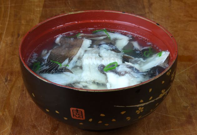 シモフリガレイの潮汁 あらを集めて置く。湯通しして残った鱗やぬめりを流す。これを昆布だしで煮だして酒・塩で味つけする。とてもうま味豊かな汁になった。嫌みのない味わいで非常においしい。クリックで閉じます![]()
