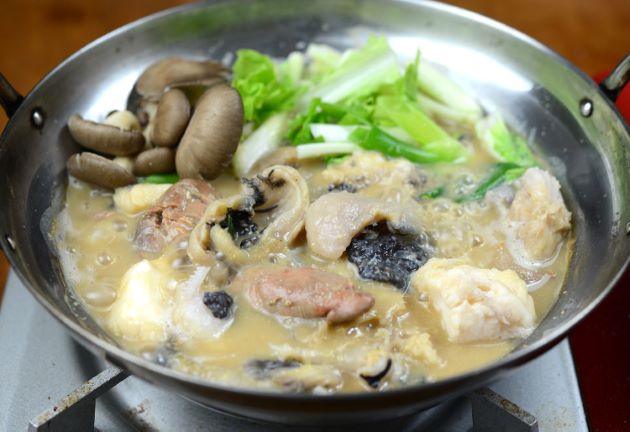 シモフリハナアンコウのみそ仕立て鍋 そのときの気分で醤油にしたり、みそにしたりする。少量の加減みそで煮ると皮や筋肉、内臓から水分が出てくる。この汁自体に味があり、とろっと半分とろけた皮や胃袋が実に味わい深い。皮などは適当に切る。湯通しして冷水に落として表面のぬめりを流す。水分をよくきり、加減みそ(みそ・酒・みりん・水)で煮ながら食べる。野菜などはお好みで。クリックで閉じます![]()