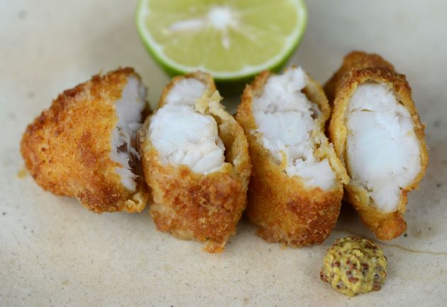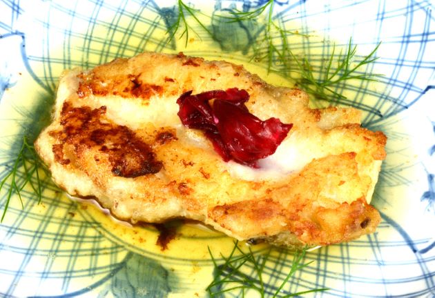 シモフリハナアンコウのフライ 水分が多いので、ペーパータオルにくるむとすぐに水が出てくる。今回は水洗いして体幹部分の身を3度水分を抜いて使った。豚のヒレ肉のように棒状の身である。塩コショウする。小麦粉をまぶして溶き卵につけ、パン粉をつけて揚げる。すぐ食べないと水分が出て来るので揚げたてを食べて欲しい。ふんわりと柔らかく、どことなくエビに近い風味が感じられる。クリックで閉じます![]()