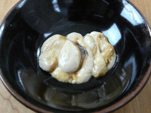 シャゴウのトーフ(ギーラのトーフ、ギーラの肝) シャコガイ類(石垣島ではギーラ)の軟体を取り出すと白い球形の物体がある。これを石垣島ではギーラのトーフというらしい。これ単体でも売っている模様だが、実に美味。ポン酢で食べたり、フライにしたりもするらしいが、このままで十二分にうまい。