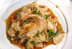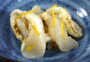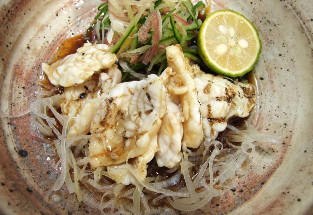 ショウサイフグの湯引き 水洗い(毒を除去)し、皮を引き三枚に下ろす。これを軽く湯引き、氷水に落としてよく水分を切る。冷蔵庫などで少し寝かせてもいい。これをたた大振りに切る。柑橘酢(ポン酢)で食べる。香辛野菜、季節の野菜などと合わせて美味。クリックで閉じます![]()