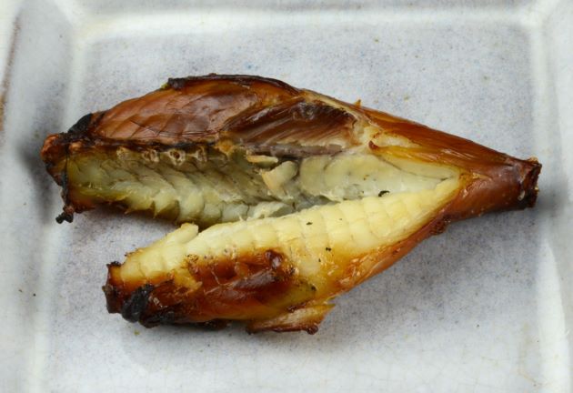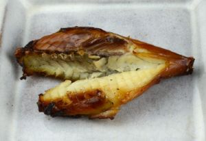 ショウサイフグのみりん干し 小さな個体を水洗いして毒を除去する。水分をよくきり、醤油・砂糖・みりんの地に半日つけ込んで干し上げる。焼きやすいように半割にして焼き上げる。干すのと焼くので身が締まってとても味わい部貝。気軽に手で摘まんで食べて欲しい。クリックで閉じます![]()