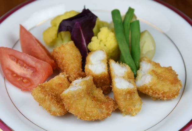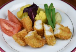 ショウサイフグのフライ 水洗いして毒を除去する。三枚に下ろして腹骨を取る。水分をよくきり、小型はこのままでいいが、大型は切れ目を入れて少し平たくする。ペーパータオルにくるんで半日以上寝かせる。(揚げ物は必ずしも寝かせなくてもいい)塩・コショウして小麦粉をまぶし、溶き卵に潜らせてパン粉をつけて高温で短時間揚げる。あまり揚げすぎると硬くなる。食感は鶏肉に近くて、魚らしいうま味が堪能できる。クリックで閉じます![]()