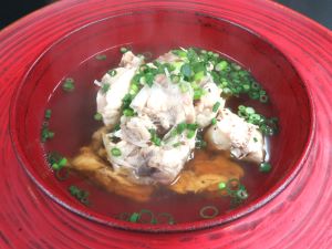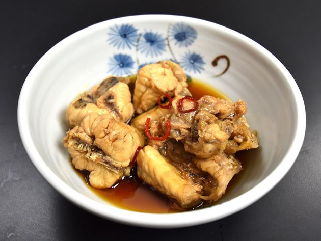 ショウサイフグの煮つけ 水洗いして毒を除去。ペーパータオルなどに来るんで半日以上寝かせる。ぶつ切りにして振り塩をして酒・砂糖・しょうゆ・水で甘辛く煮つけたもの。味付けはお好みで。古い物は湯通しした方がきれいに仕上がる。ここではしょうがではなく鷹の爪(赤唐辛子)を使っている。煮ても硬く締まりすぎずとてもおいしい。クリックで閉じます![]()