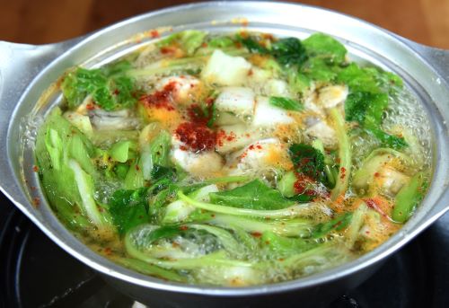 ショウサイフグの韓国風鍋 水洗いして毒を除去。筋肉だけにする。これをペーパータオルなどにくるんで一晩寝かせる。適当に切り、振り塩をして表面に出て来た水分を拭き取る。湯通しして冷水に落として霜降りにし、水分をよくきる。鍋にだし(煮干しだし・酒・塩。だしはなんでもよくダシダを使ってもいい)。野菜などを用意し、煮ながら食べる。唐辛子は韓国産を使ったが、必ずしもいれなくていい。このまま汁と一緒に食べるが、もの足りなければ醤油やポン酢で。