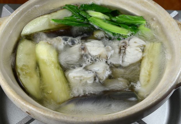 ショウサイフグの魚醬鍋 ここで使ったのは石川県の「いしる」だが、ナンプラーでも秋田の「しょっつる」でもいい。水洗いしてペーパータオルなどにくるんで半日以上寝かせる。適当にきり振り塩をして表面に出て来た水分を拭き取り、湯通しして冷水に落とし霜降りに。水分をよくきり、水・魚醬・酒を合わせた中で煮る。野菜は季節のものを使うといい。秋などナスがとても合う。クリックで閉じます![]()