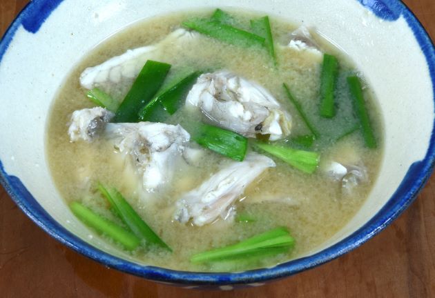 ショウサイフグのみそ汁 水洗いして水分をていねいにとる。できればペーパータオルにくるんで半日以上寝かせたいが、そこまでする必要はないかも。適当に切り、湯通しして冷水に落として霜降りにする。水分をよくきり水から煮出してみそを溶く。クリックで閉じます![]()