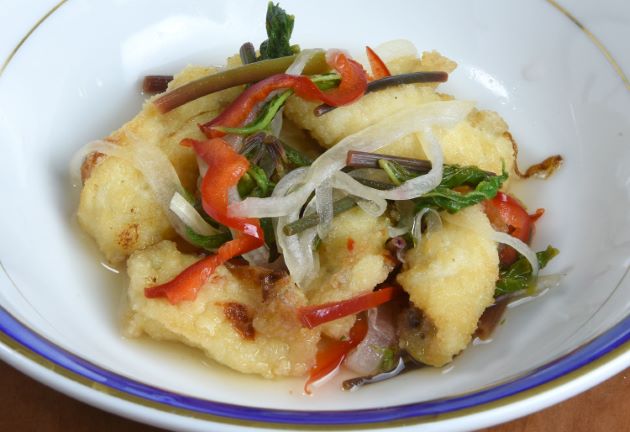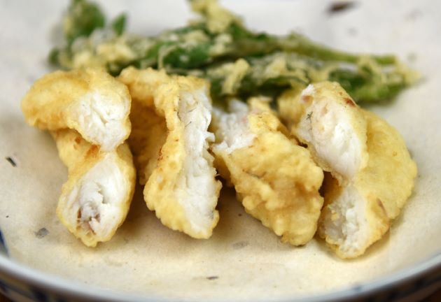 ショウサイフグの天ぷら 水洗いして毒を除去する。三枚に下ろして腹骨を取り、身に切れ目を入れるこれをペーパータオルにくるんで半日以上寝かせる。(揚げ物は必ずしも寝かせなくてもいい)振り塩をして表面に出て来た水分をよくきり、衣をつけて高温で短時間揚げる。フライよりも本種の持ち味がよくわかると思う。ほどよく口の中でほぐれて甘味がある。クリックで閉じます![]()