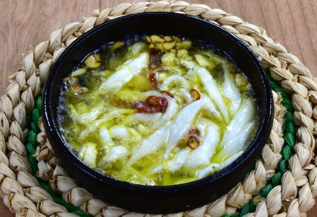 シラウオのアヒージョ アングラスならぬシラウオのアヒージョだ。器にたっぷりのニンニク、鷹の爪、オリーブオイルを入れて、塩水でざっと洗って水分をよく切ったシラウオを入れる。火にかけてニンニクの香りが立って、油が泡立ち始めたら出来上がり。シラウオだけではなく、オイル自体もおいしい。クリックで閉じます![]()