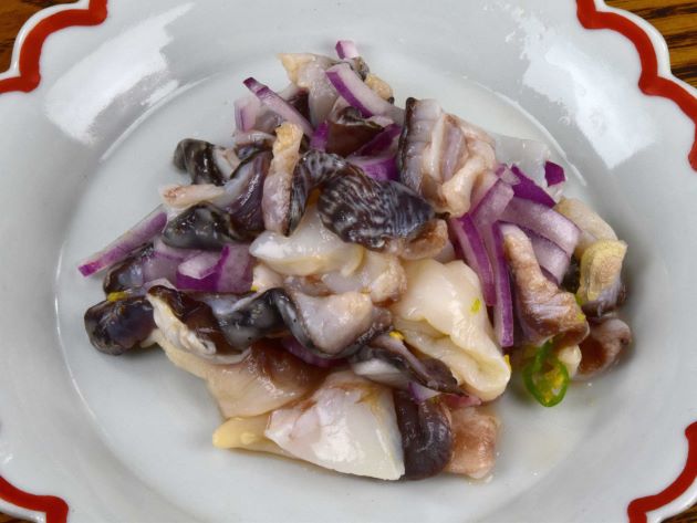 シラナミの肝(ギーラのトーフ、ギーラの肝、アジケー豆腐) 軟体の白く長球形の部分を石垣島で「ギーラのトーフ(豆腐)」といって単独で流通するという。これをそのまま生で食べてみた。強いカキに似たうま味と苦みがあって、しかもカキよりも磯の風味があり、後味が意外に軽い。非常に美味である。泡盛などに合う。