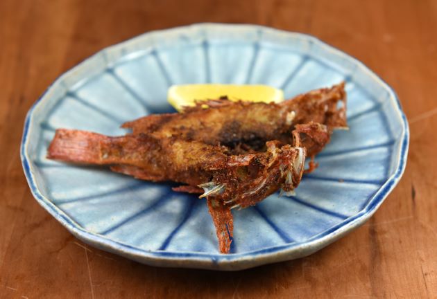 シロカサゴの唐揚げ 骨張って見えるが、骨はあまり硬くない。唐揚げ向きの魚である。水洗いして背開きにして二度揚げしてみた。頭部も中骨も丸ごとサクサク食べられる。身の甘味も増しており、かなりの美味。クリックで閉じます![]()
