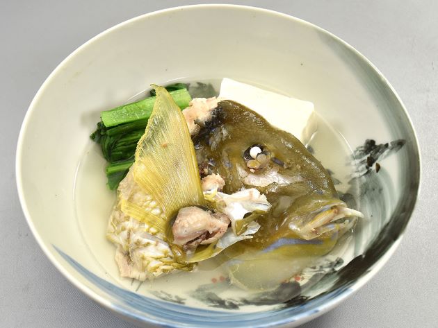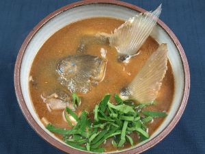 マクブの魚汁 沖縄ではハタやベラ類などを魚汁にする。ようするに魚のみそ汁であるが、汁も魚自体も楽しむもので、魚の旨みのあるなしで味の良し悪しが左右される。この魚汁に用いてもっとも美味なもののひとつ。クリックで閉じます![]()
