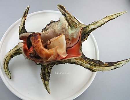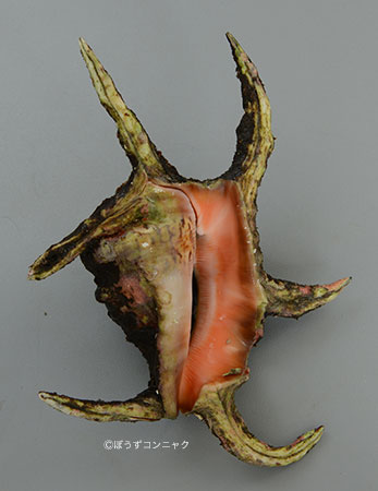 全長30cm前後になる。貝殻は分厚く持ち重りがする。水管は伸びず、6本の棘を持つ。