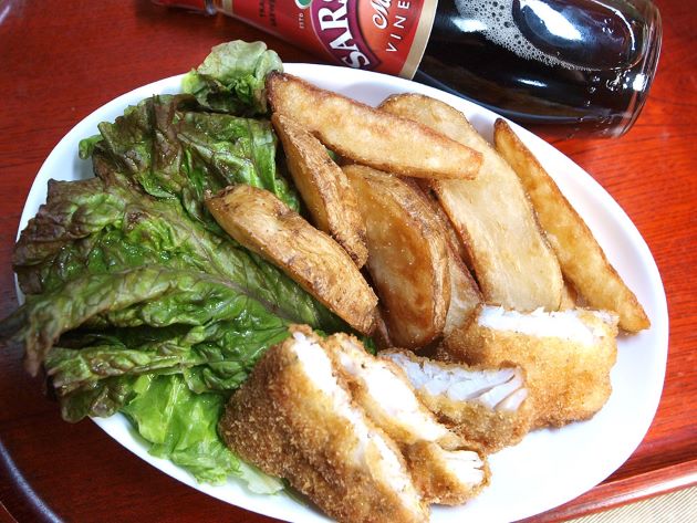 スケトウダラ本体フィッシュ&チップス スケトウダラの切り身に小麦粉をまぶし、小麦粉・ビール・サラダ油・塩コショウの衣をつけ、ジャガイモと一緒に揚げたもの。タラ科の上品で揚げても硬くしまらない身質にもっとも適した料理法だ。