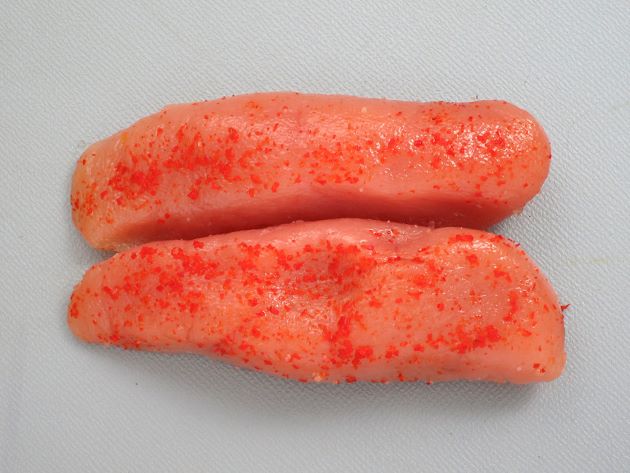 卵巣明太子 朝鮮半島周辺ではスケトウダラを「ミョンテ(明太、明太魚)」、「とんて」といい、これを「めんたい」と聞いた。その子であるので明太子。朝鮮半島でも塩漬けなどの加工品があり、ここに大量の唐辛子を振り込みまぶしたものだった。これは戦前にかなり輸入されてきており、味のいいものであった。大阪市鶴橋の韓国食材店などで売られているものは「ミョンテ(明太、明太魚)」の形を残しているのかも知れない。関連コラム(加工品)