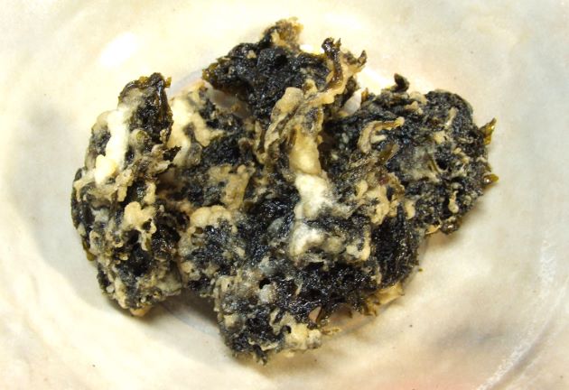スサビノリの天ぷら(生ノリの天ぷら) 生ノリは水分をよく切って揚げるとさくっとした食感に磯の香り、ノリのうま味が感じられて美味しい。生ノリはそのままでもいいが気になるなら流水でさっと洗って、水切りをしてもいい。水分をよくきり小麦粉をまぶし、ぽんぽんと叩いて衣をつけて揚げる。クリックで閉じます![]()