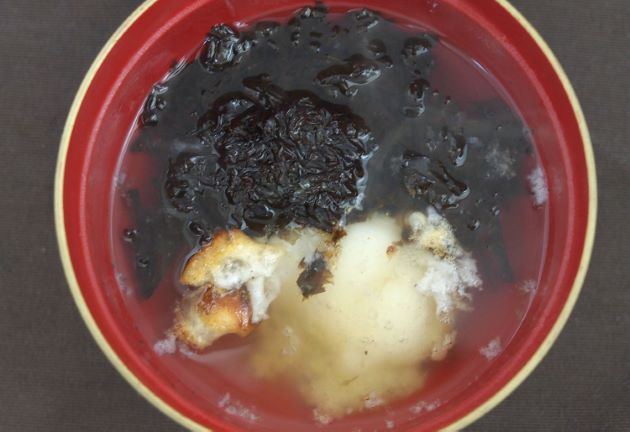 スサビノリの雑煮(生ノリの雑煮) 吸物でもある。生ノリはそのままでもいいし、気になったら流水でさっと洗ってもいい。布などに挟んで水分をきる。とんとんを細かく切って、カツオ節出しに酒・塩、焼いた餅を入れた中にふわりと乗せる。ノリは温まると香りが立つ。クリックで閉じます![]()