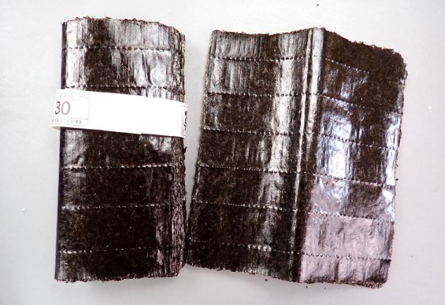 ■ 海苔1枚の大きさは横19センチ、縦21センチ。10枚で1帖という。