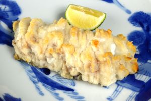 スズハモの塩焼き 水洗いして開き、片身にして背鰭・腹鰭をていねいに切り取る。骨切りをして振り塩。これをじっくり時間をかけて焼き上げる。やや淡泊過ぎる嫌いはあるものの、捨てがたい味である。