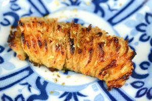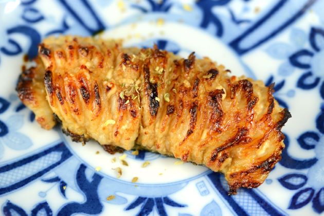 スズハモの蒲焼き 水洗いして開く。片身にして鰭などを取る。水分をよくきり、骨切りをしてまず素焼きにする。8分通り焼き上がったら醤油・みりん同割りのたれを塗りながら仕上げる。単に焼くとうま味に欠けるが、これを醤油・みりんの調味料が補ってくれる。